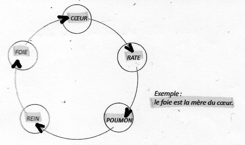 La loi de génération, dans laquelle le méridien et l'organe d'un élément sont la mère de ceux de l'élément suivant le sens des aiguilles d'une montre.