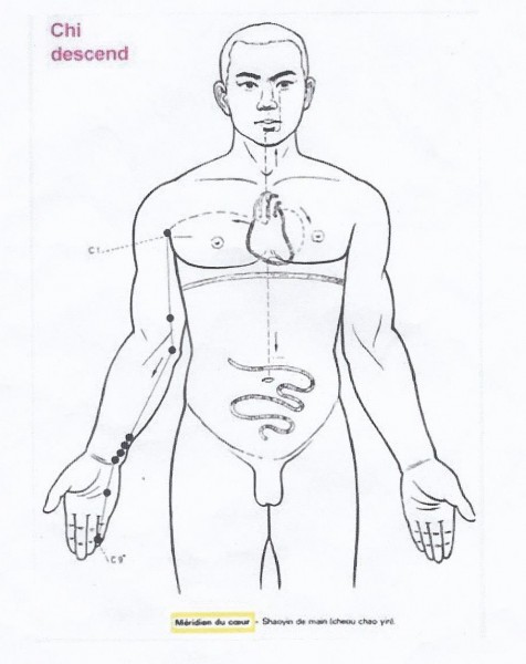 Ce méridien est relié à l'émotivité, aux émotions extrêmes ou chocs, à la chaleur interne. Il est aussi relié aux activités intellectuelles et la clarté d'esprit. En harmonie, nous nous sentons en paix, tendre, aimant et aimé.